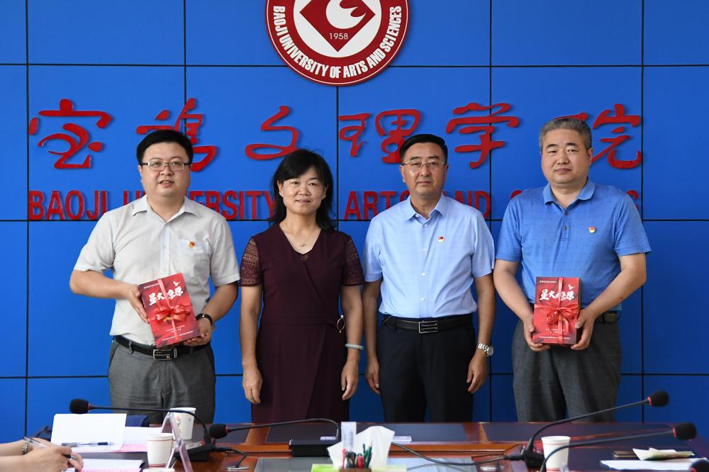 之后,地校双方举行了《星火燎原》光盘赠送仪式,中共宝鸡市委党史研究室主任许道平、中共宝鸡市直属机关工作委员会书记王继萍共同向宝鸡文理学院赠送了《星火燎原》宣传片光盘,马克思主义学院党总支书记张鹤、院长孙宏健代表宝鸡文理学院接受光盘。
