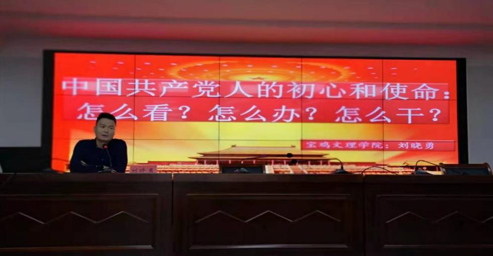 刘晓勇副教授于9月18日,在马克思主义学院博文楼1201会议室举办的“不忘初心、牢记使命”主题教育系列报告首场报告会上,对学院党政领导、党总支委员、支部书记和全体党员教师进行了宣讲。9月24日,在宝鸡市教育局齐燕楼3楼会议室举办的“不忘初心、牢记使命”主题教育系列报告报告会上,对局系统全体党支部书记进行了宣讲。9月25日,在宝鸡文理学院老校区主楼5楼会议室举办的“不忘初心、牢记使命”主题教育系列报告报告会上,对计算机学院全体教师和学生党员进行了宣讲。9月30日,在宝鸡市渭滨区委1楼报告厅举办“习近平总书记生态文明思想”主题报告报告会上,对渭滨区委学习组及渭滨区全体副科级以上干部进行了宣讲。刘晓勇副教授的宣讲提高了党员干部服务群众的意识,使听众的灵魂受到触动,思想得到进一步升华,对“不忘初心、牢记使命”有了更加全面、深刻的理解和感悟。