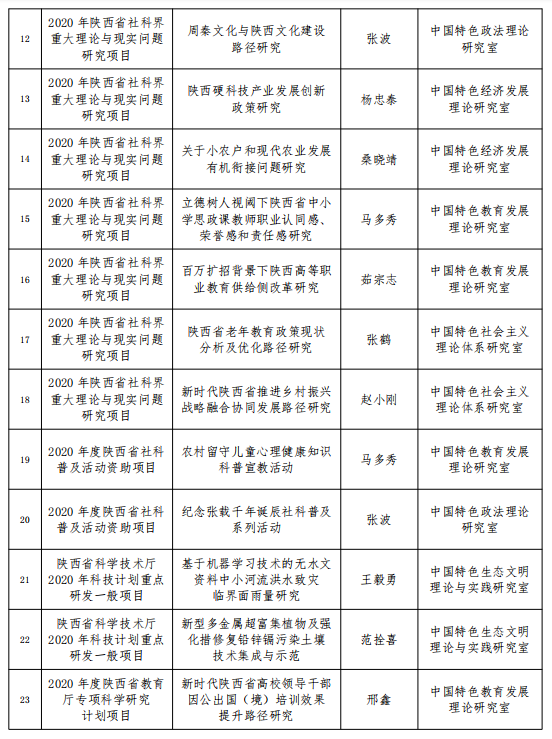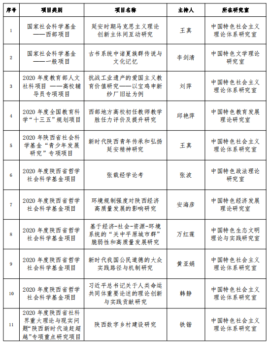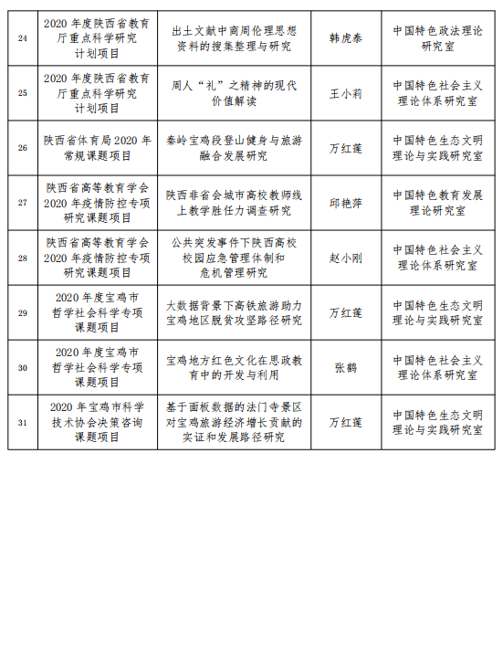 截止目前,陕西省重点中国特色社会主义理论体系研究中心(宝鸡基地)2020年共获批科研项目31项。其中,国家社科基金项目2项、教育部人文社科项目1项、全国教育科学规划项目1项、陕西省哲学社会科学基金项目6项、陕西省社会科学界联合会项目10项、陕西省科技厅项目2项、陕西省教育厅科研计划项目3项、陕西省体育局项目1项、学会及市级项目5项。