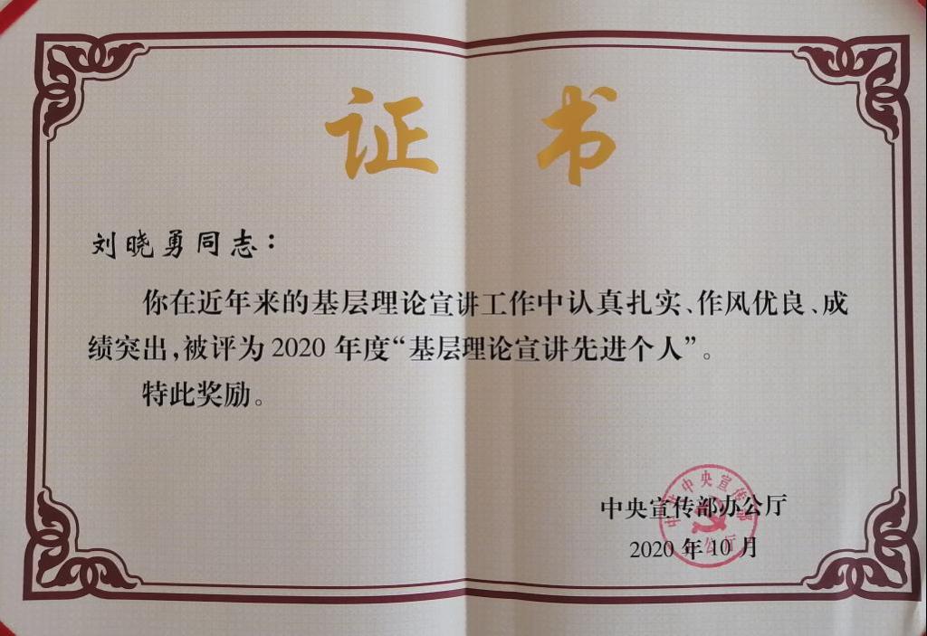 近日,中央宣传部办公厅发布了《关于表彰基层理论宣讲先进集体、个人和优秀理论宣讲报告、公众号的决定》,对全国46个基层理论宣讲先进集体、37名基层理论宣讲先进个人、17篇优秀理论宣讲报告和20个优秀理论宣讲公众号进行通报表彰。宝鸡文理学院马克思主义学院副院长、陕西省重点中国特色社会主义理论体系研究中心(宝鸡基地)骨干研究员、市委理论讲师团(专家库)成员刘晓勇博士被授予中宣部2020年“基层理论宣讲先进个人”荣誉称号。11月5日至7日,刘晓勇博士受邀参加了中央宣传部理论局主办的“学习贯彻党的十九届五中全会精神研讨班”,作为全国基层理论宣讲先进个人代表参加了中央宣传部颁奖典礼并上台领奖。
