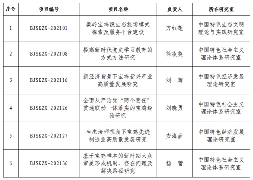 近日,陕西省重点中国特色社会主义理论体系研究中心(宝鸡基地)骨干研究员获批6项2021年度宝鸡市哲学社会科学专项课题,为宝鸡经济发展、党史教育、党的建设等工作提供智力支持,助力地方经济社会发展。