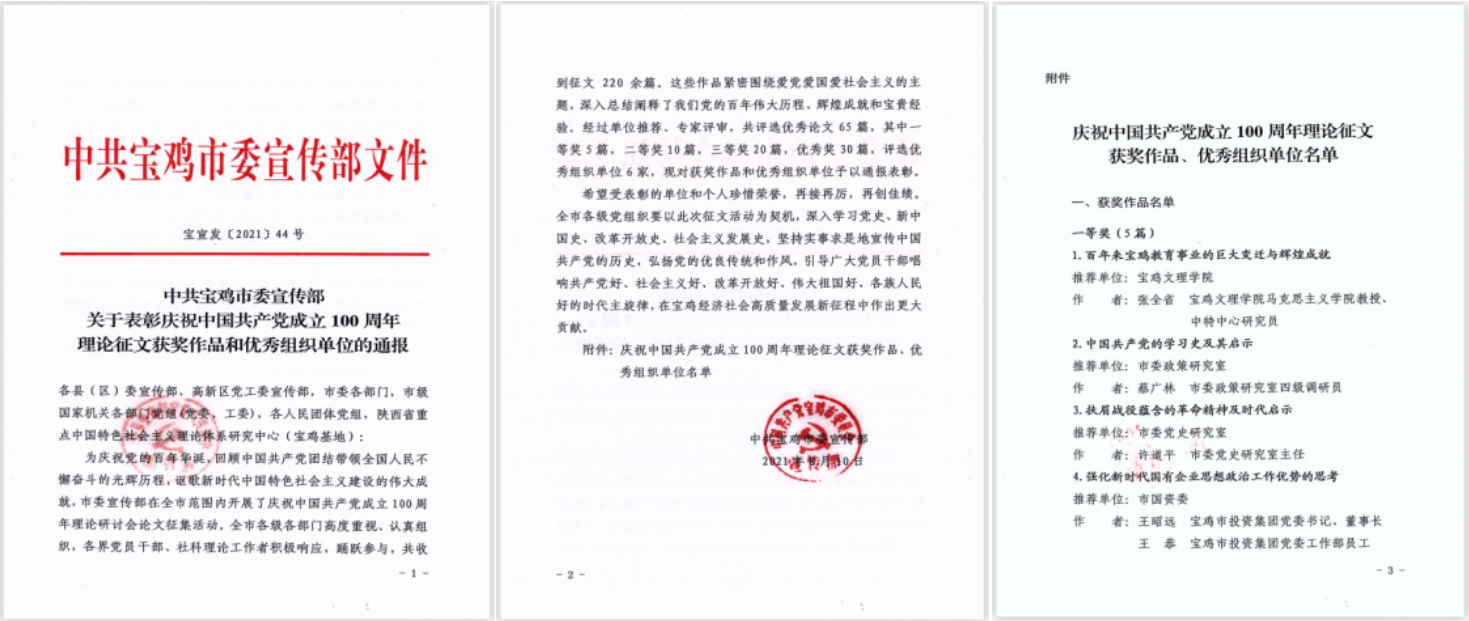 为庆祝党的百年华诞,回顾中国共产党团结带领全国人民不懈奋斗的光辉历程,讴歌新时代中国特色社会主义建设的伟大成就,中共宝鸡市委宣传部在全市范围内开展了庆祝中国共产党成立100周年理论研讨会论文征集活动。马克思主义学院教师、陕西省重点中国特色社会主义理论体系研究中心(宝鸡基地)骨干研究员张全省教授的理论文章《百年来宝鸡教育事业的巨大变迁与辉煌成就》理论征文一等奖。