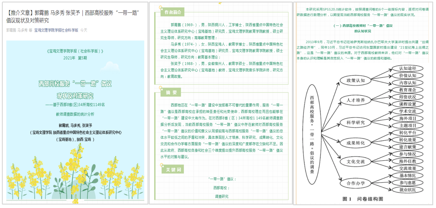 《宝鸡文理学院学报(社会科学版)》(2021年 第5期)刊发中心中国特色教育发展理论研究室骨干研究员郭霄鹏、马多秀、张笑予合著的理论文章《西部高校服务“一带一路”倡议现状及对策研究——基于西部8省(区)34所高校1149名教师调查数据的统计分析》。