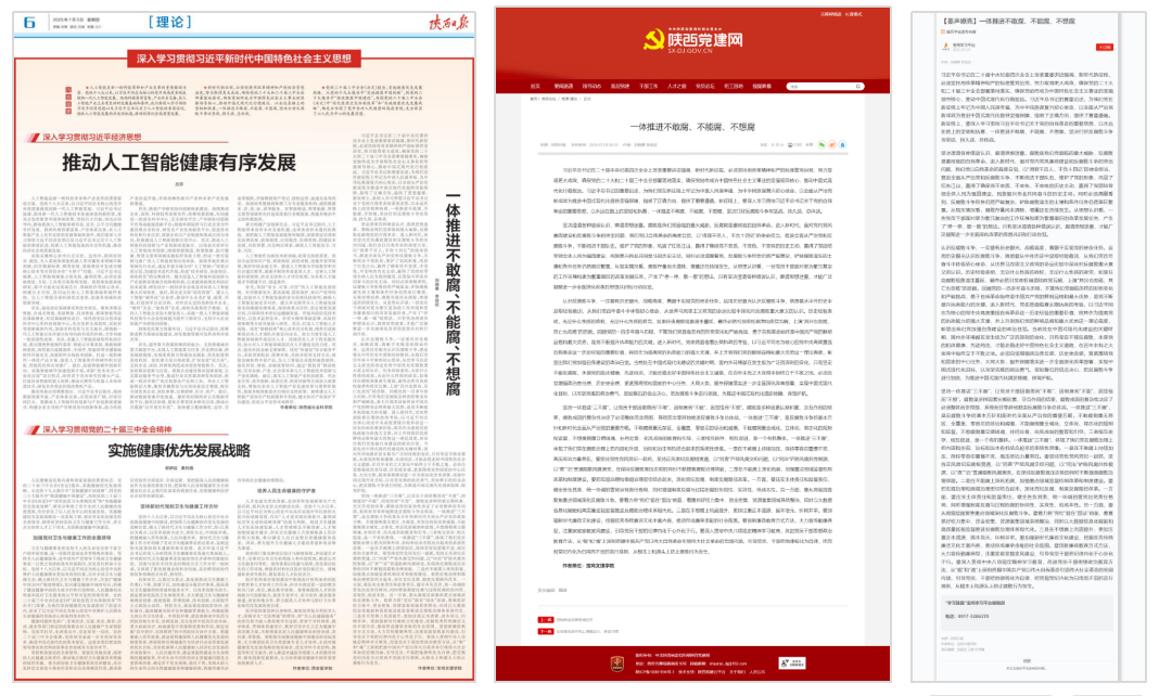 7月6日,《陕西日报》理论版刊发刘晓勇、李佳欣署名文章《一体推进不敢腐、不能腐、不想腐》。7月18日,《云南日报》理论版刊发刘晓勇、肖玥瑢署名文章《党员干部要在遵规守纪中改革创新》。2025年第2期《宝鸡党史》刊发刘晓勇、徐艺萌署名文章《中国共产党落实中央八项规定精神的实施进程、实际效果和实践经验》。2025年第4期《陕西政法天地》刊发刘晓勇、陈顺日署名文章《党员干部要学会在遵规守纪中改革创新》。系列文章围绕习近平总书记在二十届中央纪委四次全会上的重要讲话精神,阐述了新征程上反腐败斗争的关键意义与实践路径,系统分析了把全面从严治党推向纵深的重大意义。