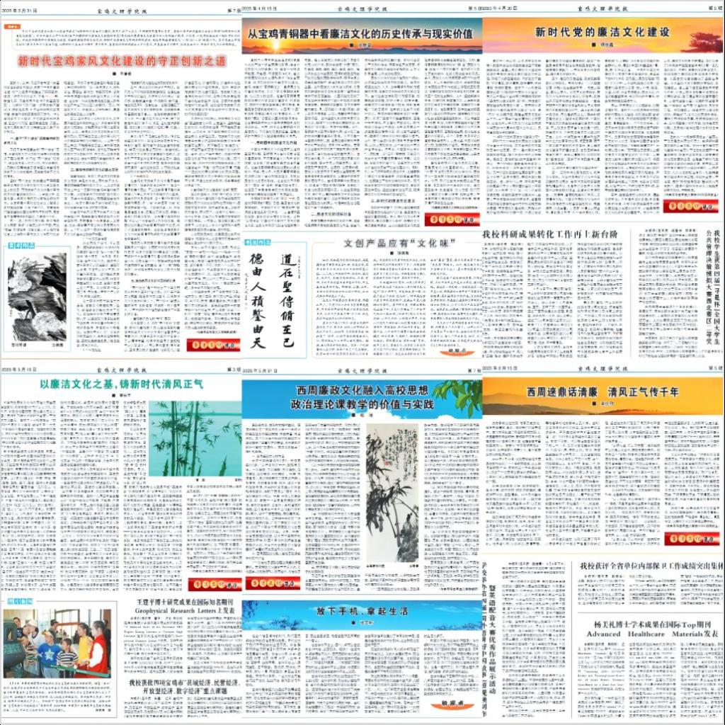 深入贯彻中央八项规定精神学习教育开展以来,中心骨干研究员在《宝鸡文理学院报》集中刊发深入贯彻中央八项规定精神学习教育主题理论文章。3月31日,《宝鸡文理学院报》刊发朱慧芸《新时代宝鸡家风文化建设的守正创新之道》;4月15日,刊发张根豪《从宝鸡青铜器中看廉洁文化的历史传承与现实价值》;4月30日,刊发杨佳鑫《新时代党的廉洁文化建设》;5月15日,刊发李长宇《以廉洁文化之基,铸新时代清风正气》;5月31日,刊发赵洁《西周廉政文化融入高校思想政治理论课教学的价值与实践》;6月15日,刊发李佳欣《西周逨鼎话清廉 清风正气传千年》;6月30日,刊发上官妍璐《慎终如始廉慎为师》。