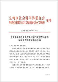 近日,宝鸡市社会科学界联合会和陕西省重点中国特色社会主义理论体系研究中心(宝鸡基地)联合发布《关于党风廉政建设理论与实践研究专项课题结项工作完成情况的通知》,中特中心9位骨干研究员申报的课题成功结项。