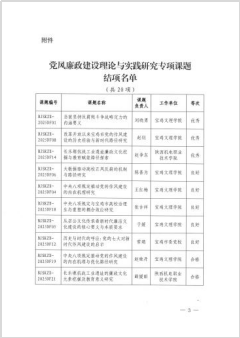 据悉,党风廉政建设理论与实践研究专项课题共受理结项申请21项,经专家严格评审、综合评议,最终确定20项课题准予结项。结项课题按成果质量划分为三个等次,其中优秀等次3项、良好等次5项、合格等次12项。