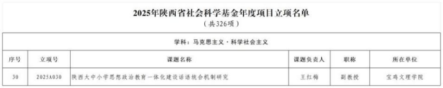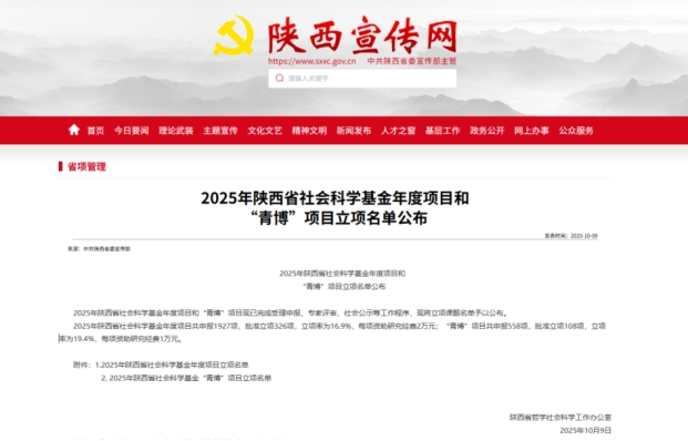 近日,陕西省哲学社会科学工作办公室公布了《2025年陕西省社会科学基金年度项目和“青博”项目立项名单》,中特中心骨干研究员王红梅副教授申报的课题《陕西大中小学思想政治教育一体化建设话语统合机制研究》获准立项。