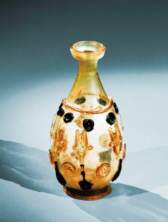 1987年,在中国陕西的法门寺,地宫中出土了20件美轮美奂的琉璃器,这是唐代传入中国的东罗马和伊斯兰的琉璃器。图为法门寺地宫中出土的盘口细颈贴塑淡黄色琉璃瓶。 法门寺博物馆供图