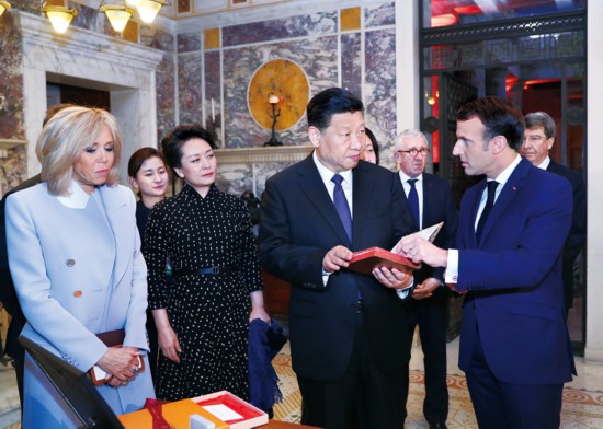 2019年3月24日,国家主席习近平在法国尼斯会见法国总统马克龙。习近平夫人彭丽媛、马克龙夫人布丽吉特参加。会见前,马克龙向习近平赠送1688年法国出版的首部《论语导读》法文版原著。 新华社记者 鞠鹏/摄